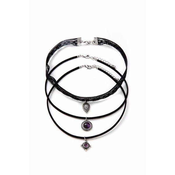 Precioso conjunto de 3 chokers de terciopelo y encaje con colgantes de piedras moradas.