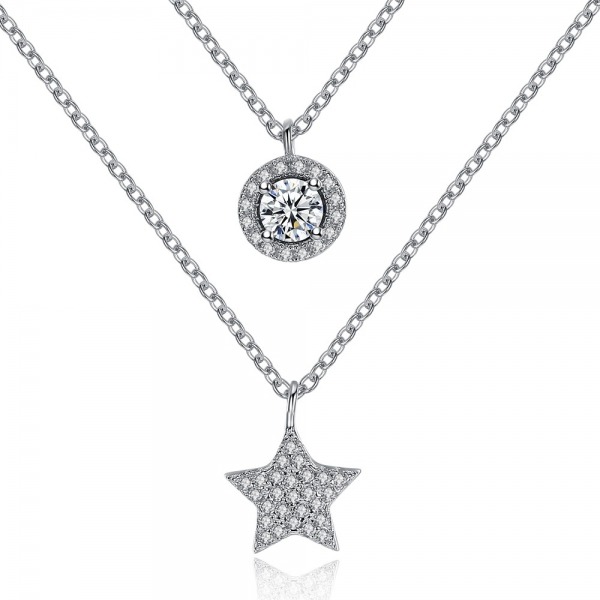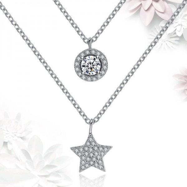 Una monada de gargantila de PLATA DE LEY formada por dos cadenitas con sus respectivos colgantitos. De una de las cadenitas cuelga una estrellita cuajada de circonitas. De la otra cadenita una circonita rodeada de un halo de circonitas más pequeñas.