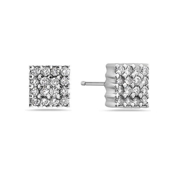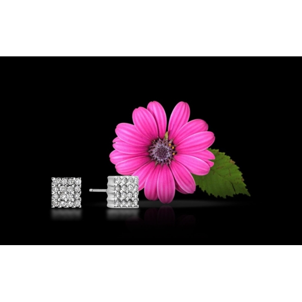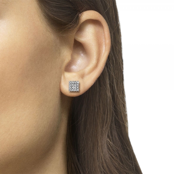 Preciosos pendientes cuadrados de Oro Blanco de Primera Ley y 16 circonitas naturales blancas de máxima calidad grado AAA. El cierre es de presión con volante lo que garantiza un ajuste máximo al lóbulo de la oreja.
