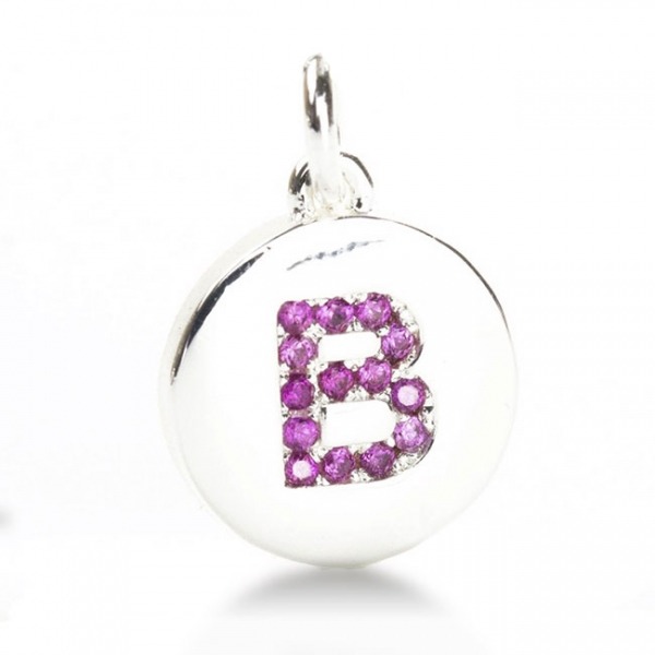 Preciosa pulsera de bolitas de plata de ley y cordón negro de macramé con charm redondo letra B con circonitas rosas.