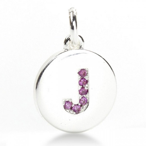 Preciosa pulsera de bolitas de plata de ley y cordón negro de macramé con charm redondo letra J con circonitas rosas.