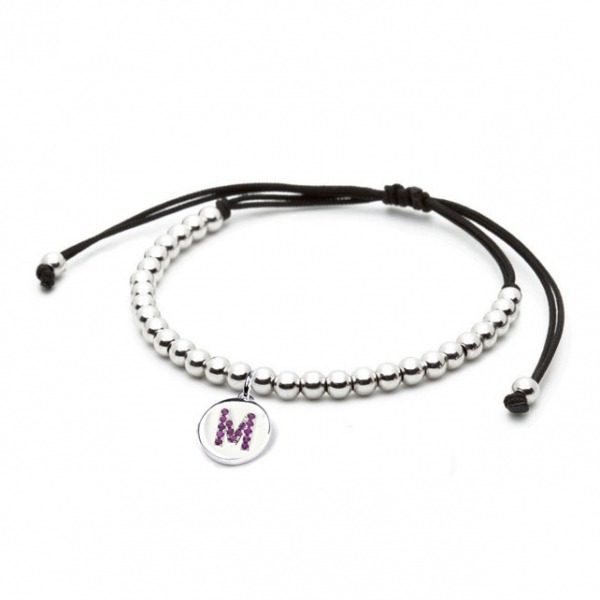 Preciosa pulsera de bolitas de plata de ley y cordón negro de macramé con charm redondo letra M con circonitas rosas.
