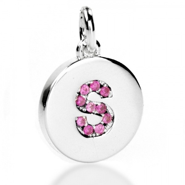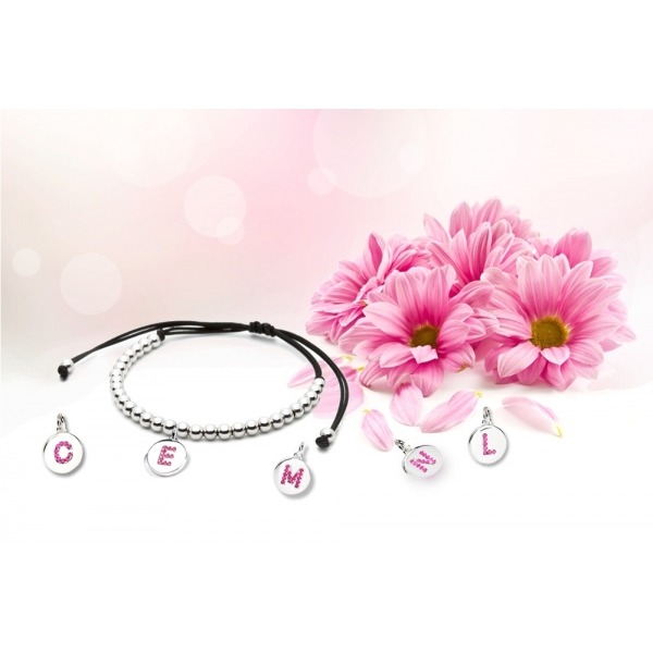 Preciosa pulsera de bolitas de plata de ley y cordón negro de macramé con charm redondo letra S con circonitas rosas.