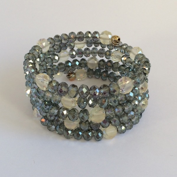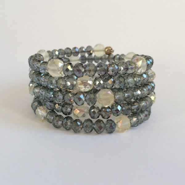 Brazalete multivuelta de acero y cristal checo azul plomo y opalescente. Espiral de cinco vueltas, se adapta a cualquier medida de muñeca. Brillo extraordinario. Colores neutros que combinan con todo estilismo.