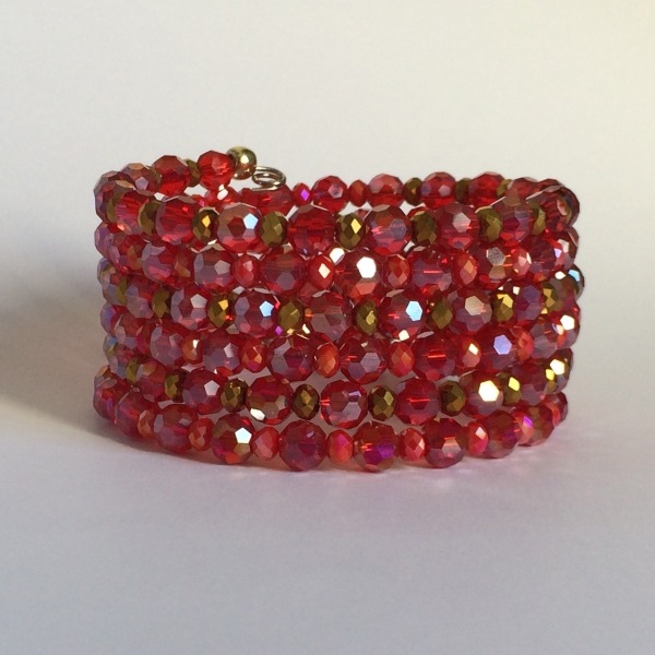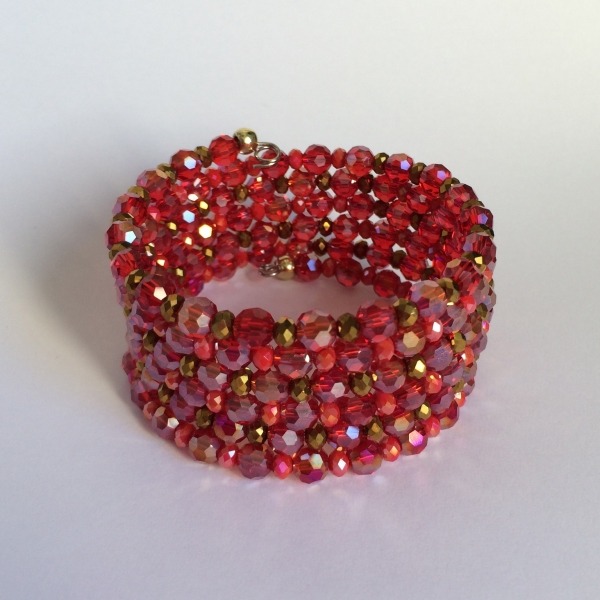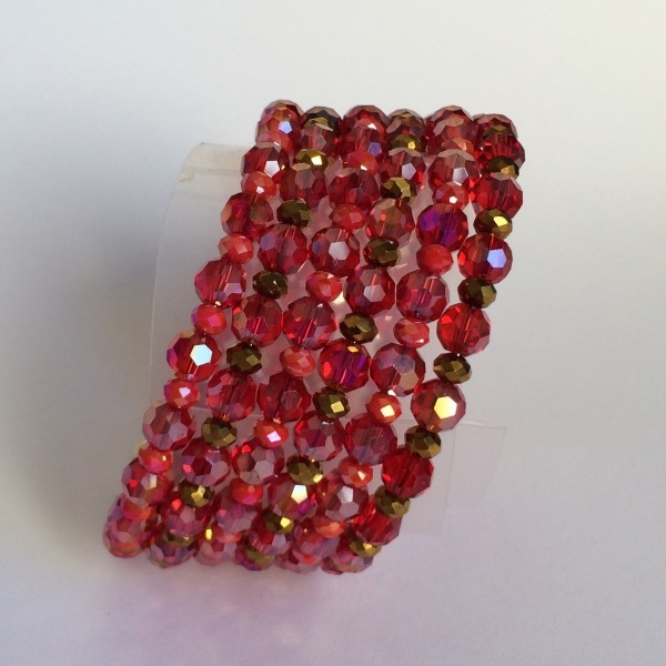 Pulsera múltiple de seis vueltas en acero y cristal checo tonos rojos y dorados alternos con rojos y ciclamen.